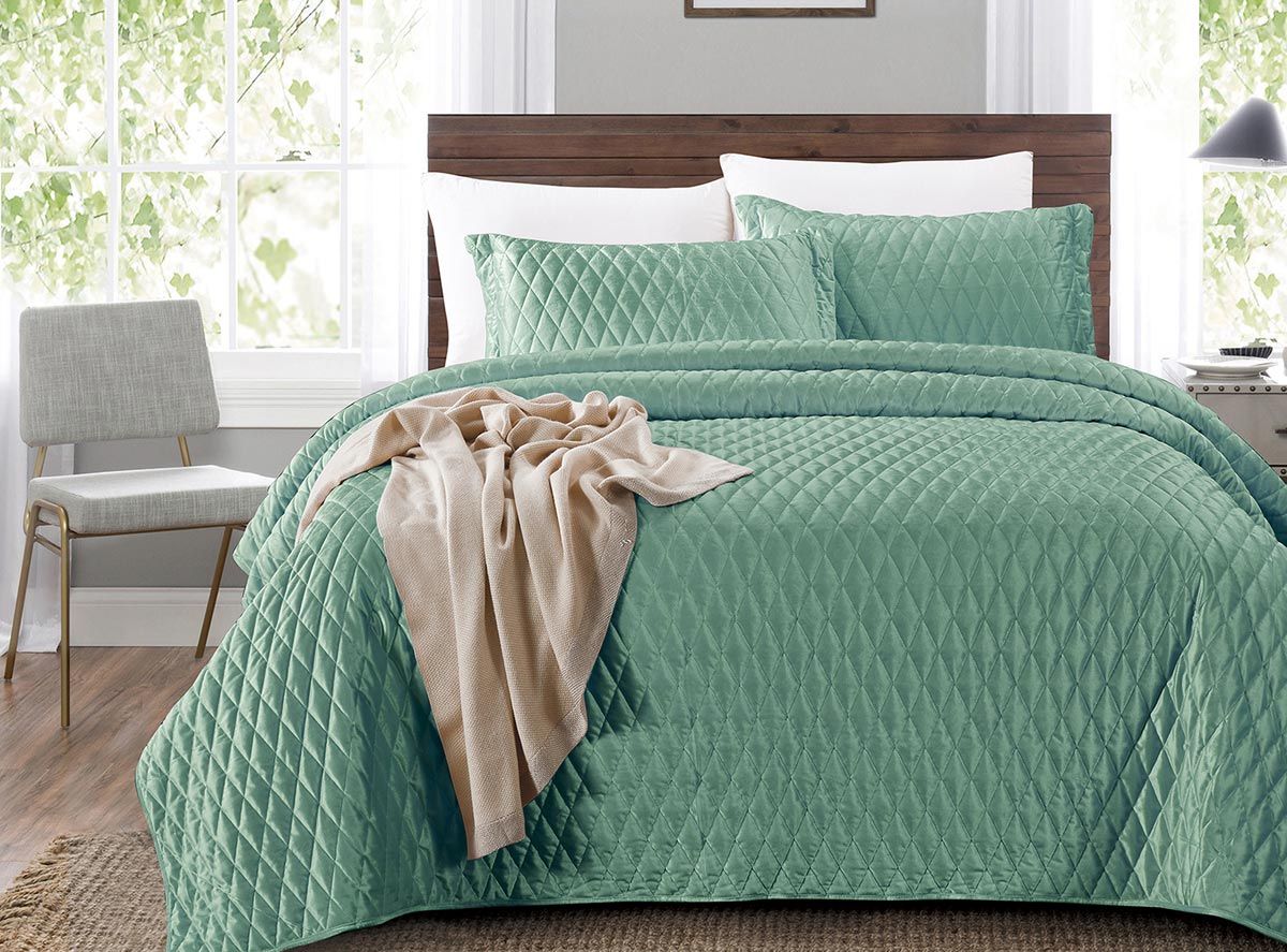 Покрывало Tango "ARABESQUE", велюр. Однотонное покрывало со стежкой в форме ромбов среднего размера с отделкой тонким кантом, соответствующим по тону основной расцветке. Поверхность обладает легким, благородным блеском, изделие прекрасно смотрится в интерьере. Материал не вызывает аллергических реакций, отличается износостойкостью и хорошо выдерживает большое количество стирок. Это покрывало украсит интерьер вашего дома, а также подойдет для подарка. Состав - полиэстер 100%. Размер покрывала 240х260 - 1 шт, наволочка 50х70 - 2 шт. Упаковка - ПВХ-сумка, на молнии, с ручками.