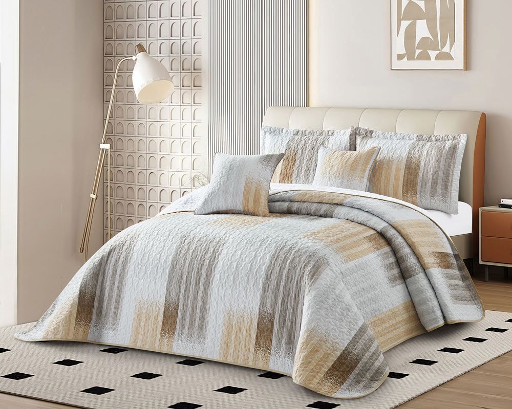 Красивое, долговечное и простое в уходе стеганое покрывало с фигурной стежкой. Оно не линяет и не окрашивается при стирке, не покрывается катышками и не оставляет ворса, приятно на ощупь. Отлично сохраняет тепло, не вызывает аллергию. Полисатиновая ткань сочетает прочность полиэстера высокого качества, и сатинового плетения, придающего ткани легкий блеск, плотность и мягкость. Покрывало прекрасно подойдет к интерьеру любой спальни. Упаковано в сумку на молнии. Размер покрывала: 240х260 см, наволочки: 50х70 см (2 шт), 45х45 см (2 шт), материал: полисатин, состав: 100 % полиэстер.