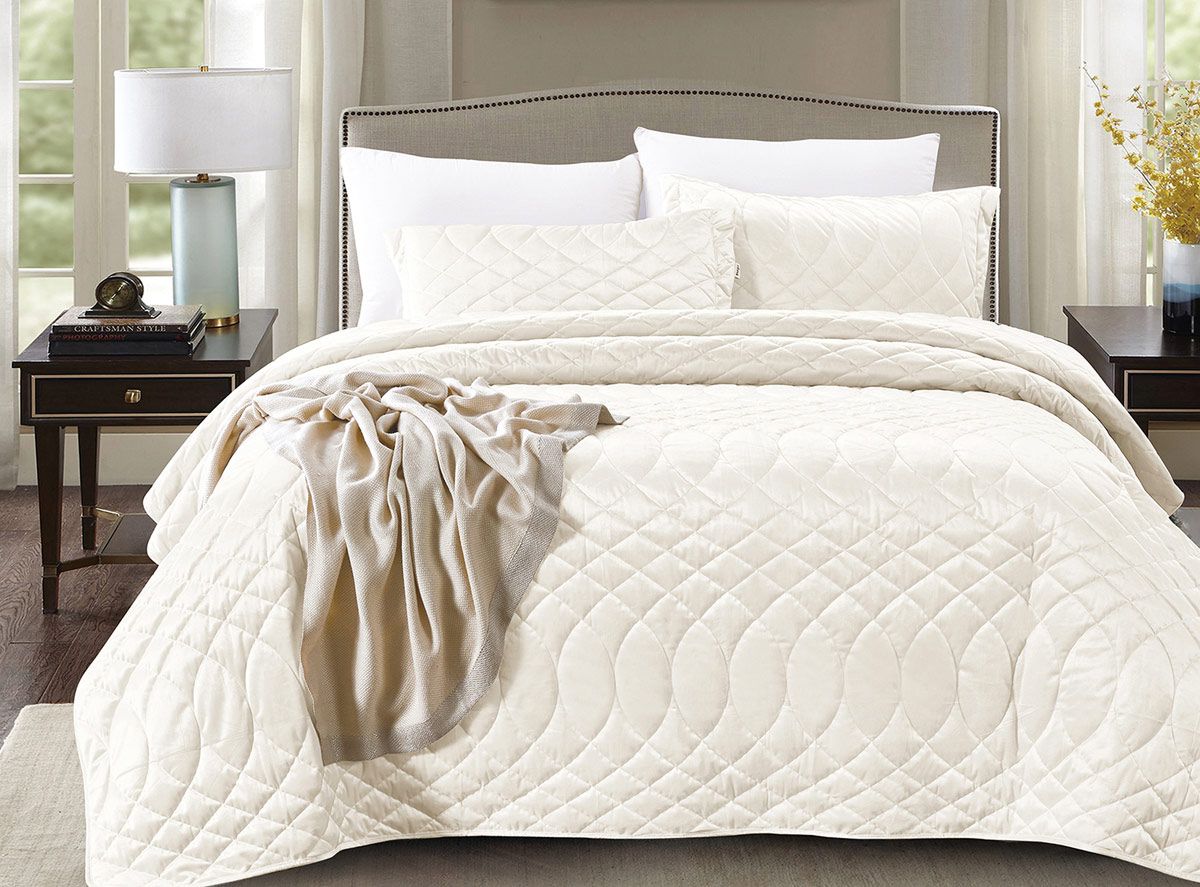Покрывало Tango "ROXETTE", велюр. Однотонное покрывало со стежкой в виде повторяющихся узоров и отделкой тонким кантом, соответствующим по тону основной расцветке. Поверхность обладает легким, благородным блеском, изделие прекрасно смотрится в интерьере. Материал не вызывает аллергических реакций, отличается износостойкостью и хорошо выдерживает большое количество стирок. Это покрывало украсит интерьер вашего дома, а также подойдет для подарка. Состав - полиэстер 100%. Размер покрывала 240х260 - 1 шт, наволочка 50х70 - 2 шт. Упаковка - ПВХ-сумка, на молнии, с ручками.